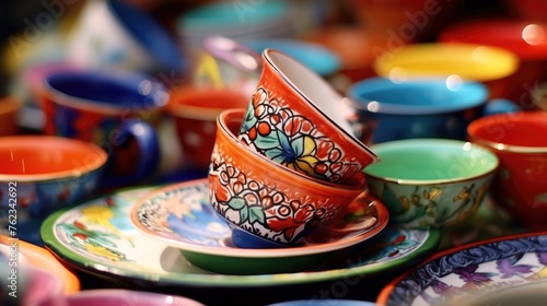 A pile of colorful plates and bowls stacked together. Perfect for kitchen or dining related designs