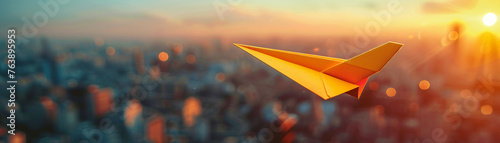 Innovative concept, yellow paper airplane above business landscape, symbolizing strategic success