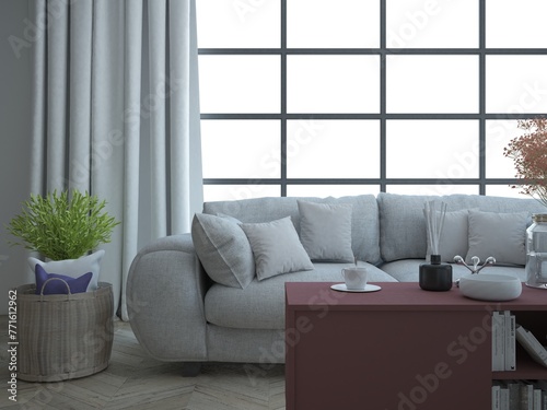 Wygodna duża szara sofa stojąca przed dużym oknem z szarymi zasłonami i bordowym stolikiem kawowym