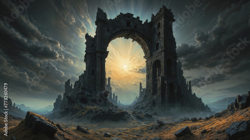 Fantasy scene of a Gigantic old portal gate at sunset, old fortress of lost civilization in ruins and towering over the forgotten and accursed landscape.