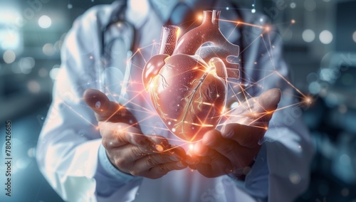 The doctor holds in his hands a hologram of a human heart. Concept of cardiology and innovative technologies.
