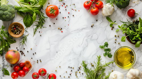 Tomatoes, Olive Oil, and Herbs on Marble Background. Fresh tomatoes, aromatic herbs, spices, and olive oil set on white marble, perfect for Mediterranean cuisine concepts, recipe websites,and culinary