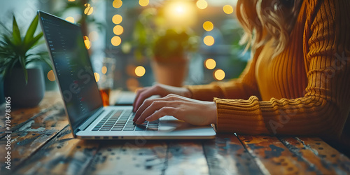 Business woman hands typing on laptop computer keyboard, surfing the internet at the office with copy space for web banner