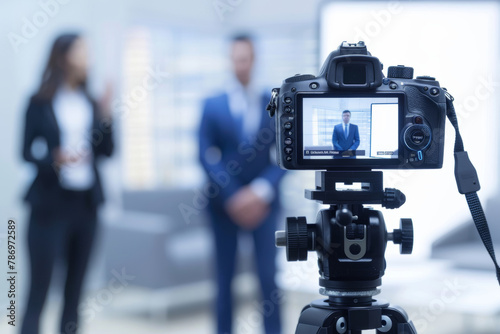 A camera is placed on the tripod, with two business people standing in front of it for an interview video, selective focus of digital camera shooting businessman in office