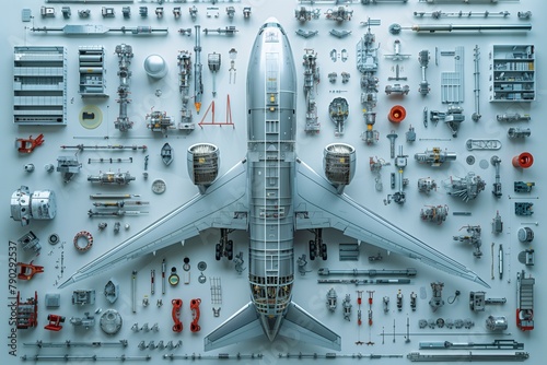 Disassembled airplane parts with full plane in the center of image. Layout image related to flights, technology, repair, support, diagnostic, travel.
