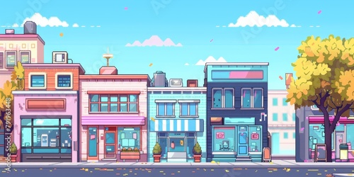 A street scene with a row of colorful buildings and a tree in the foreground. The buildings are brightly colored and the sky is blue