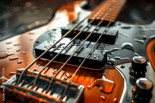 A guitar with water droplets on it. The water droplets are on the strings, the bridge, and the headstock. The guitar is a brown color