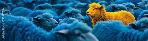 A vibrant yellow sheep stands out in a crowd of identical blue sheep, symbolizing individuality, uniqueness, and the courage to be different, created with generative AI technology