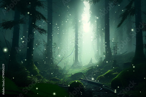 Magic green foggy misty forest with glowing fireflies.