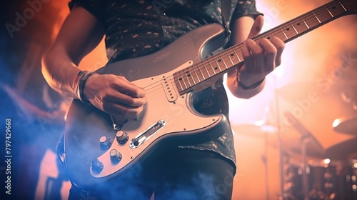 Close up musician playing electric guitar on a concert stage