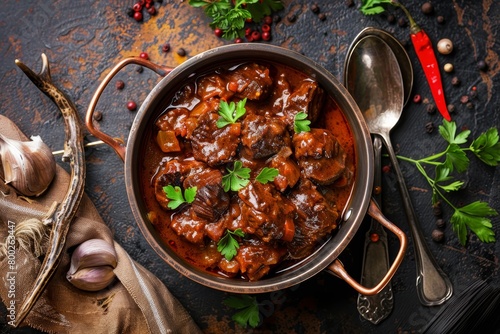 Delicious spicy venison goulash in copper pot with deer antlers viewed from above