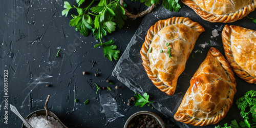 Empanadas on a slate serving board, Golden brown pastry with savory filling, Traditional Argentinean snack, Rustic presentation, top view