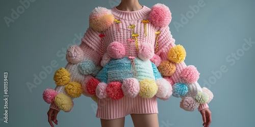 modern japan cute jumper with dangling charms, plush pom poms, and oversized safety pins