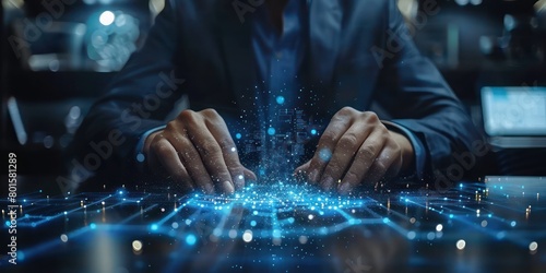 Businessman at his desk viewing a holographic display of energy networks, close-up, focus on hands, futuristic vibe