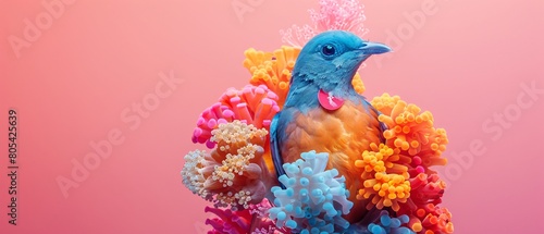 Images of strangely colored bird and colorful corals that seem unlikely to be together. on a pink background. Generative AI