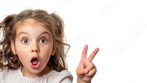 Mała dziewczynka wskazująca znak pokoju palcami, ubrana w jasną sukienkę, uśmiechnięta i radosna
