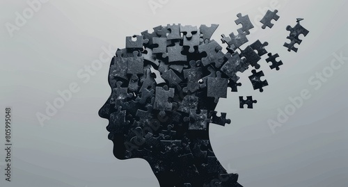 Man's head fragmented into puzzle pieces. The concept of Alzheimer's disease, dementia, memory loss and mental health.