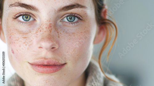 Close-up portrait of beautiful blue eyed girl with freckles on a white background.