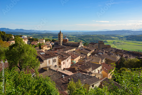 Bird's-eye view of the city of Massa Marittima with the cathedral of San Cerbone, Grosseto, Tuscany, Italy