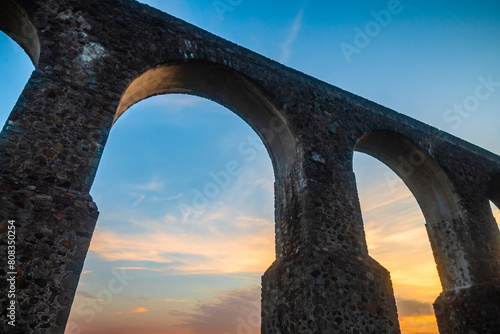 Sunrise with colored sky in aqueduct of the site arches in tepotzotlan state of Mexico
