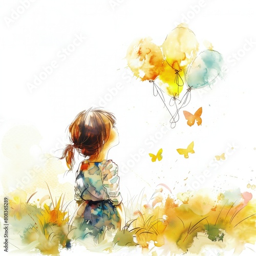 Malarstwo przedstawiające małą dziewczynkę trzymającą baloniki w tle białego tła. Praca wykonana w stylu akwarelowym na standardowej skali. Nawiązanie do Dnia Dziecka