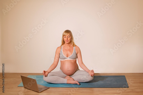 Closeup belly of pregnant woman practicing yoga online at home with laptop. Expectant mother doing prenatal yoga class or meditating during pregnancy indoors. Healthcare of mother and unborn baby.