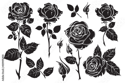 black silhouette Set of rose with leaves Flower black silhouette white background