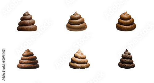 Set of realistic 3D poop in various shapes. Isolated transparent PNG background. Brown fecal matter piles. Pet poop. doo-doo. Comical concept. Wet and dry. collection 01