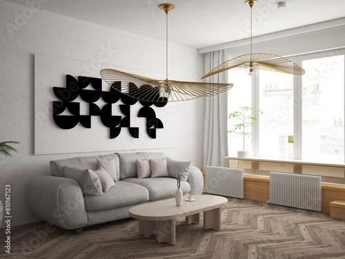 Luksusowy minimalistyczny elegancki salon z dużym obrazem artystycznym sofą z podsuszkami zasłonami i żyrandolami na suficie