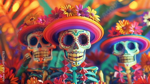 Grupa szkieletów ubranych w sombrera i różne kapelusze, w trakcie jakiejś uroczystości związanej z tradycją Dnia Zmarłych