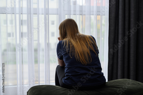 Kobieta w depresji siedzi w nowym mieszkaniu i patrzy przez okno
