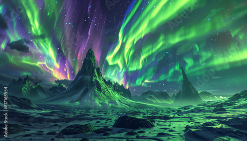 vivid aurora on an alien planet with glowing night sky and mountains, surreal and otherworldly landscape