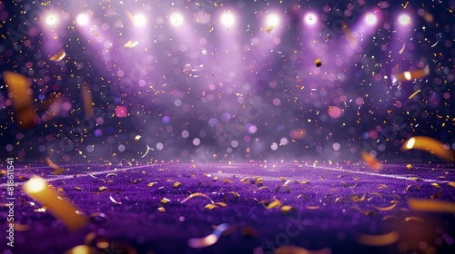 Purple background, lights and golden confetti on the purple background, football stadium with spotlights, banner for sports events