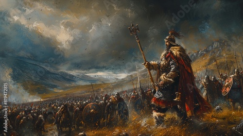 Skyhigh shot of Cu Chulainn in battle fury at the plains of Ulster , hyper detailed