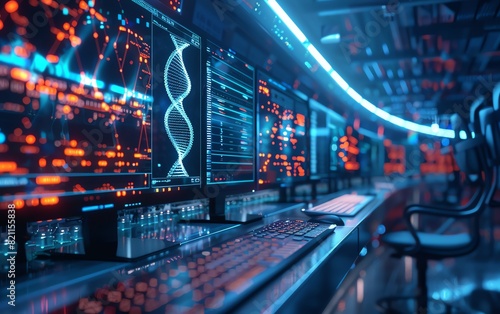 Produce a detailed image of a cuttingedge bioinformatics lab with computers analyzing DNA sequences and 3D genome models