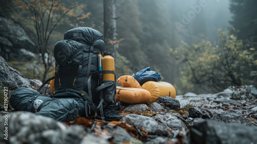 Up-close view highlights the critical gear for wilderness mountain hiking and camping, including backpacks, sleeping pads, headlamps, and survival kits