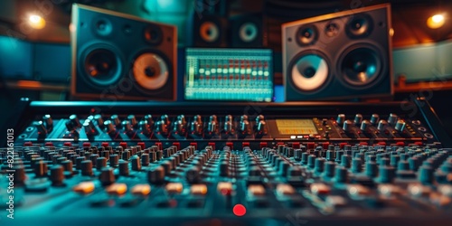 Professional audio mixing console in modern recording studio with vibrant lighting