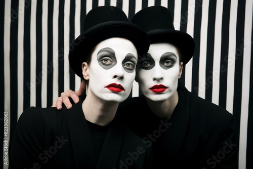 Artistic Two funny French mimes artists. Comedy pantomime entertainment performance on street. Generate ai