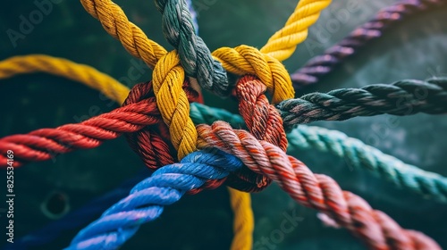 Team rope tie together, concept of unity and teamwork, work together, cooperate, strong, communication.