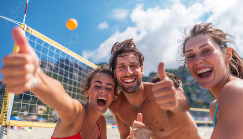 Friends cheering and giving thumbs up after a great play in beach volleyball, with copy space