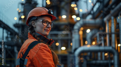 A happy woman in an orange jacket, hard hat and safety glasses stands in front of a large industrial enterprise. Petrochemical processing plant