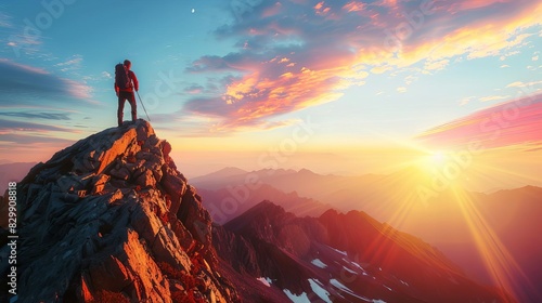 hiker standing triumphantly on mountain peak at sunset inspiring goals and achievements concept