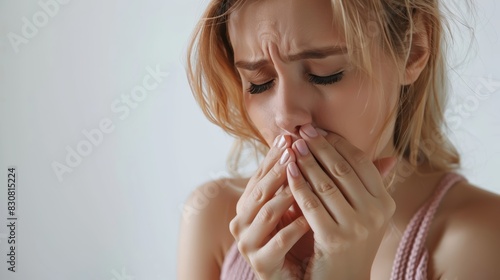 Close-up of a young woman looking sad and emotional, covering her mouth with her hands in distress.