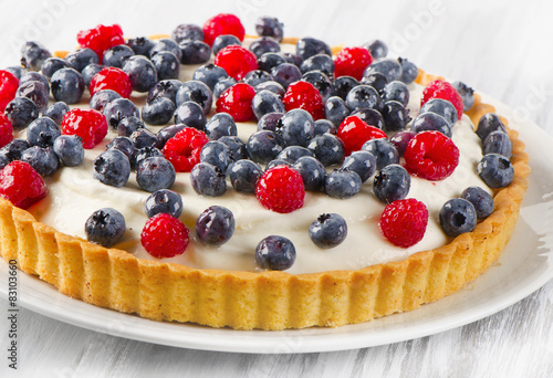 Summery Delicacy: Vibrant Berry Tart Displayed in a Modern White Kitchen