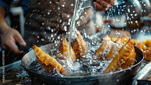 The photo shows a chef frying empanadas in a pan. The empanadas are golden brown and look delicious. The chef is carefully watching the empanadas to make sure they don't burn.