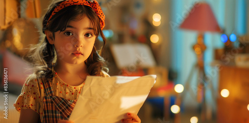 Cheerful young girl holding a script, dressed in an actress's outfit in a vibrant room