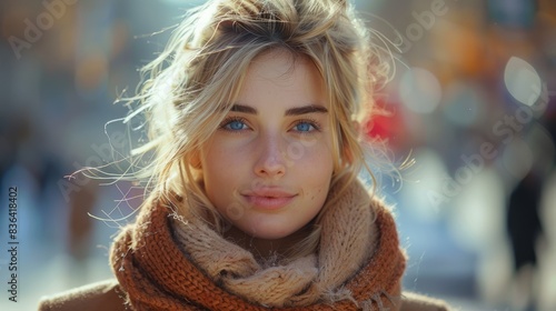 Pretty blonde woman at street level wearing winter coat and scarf. Beautiful female with straight hairstyle standing in the street with the sun behind her.