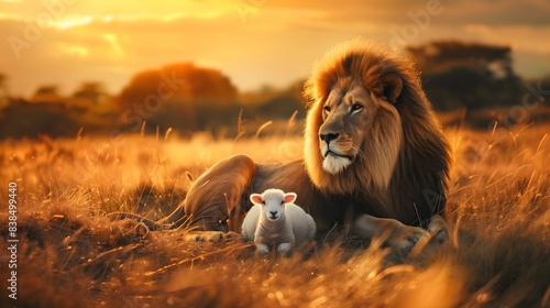 Lion and Lamb Resting in Golden Grass at Sunset. Generative AI