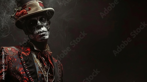 #949554332Tilted angle view of Baron Samedi, Haitian voodoo loa, standing in shadowy darkness, intricate detail on Victorian attire, dark background, eerie and mystical aura