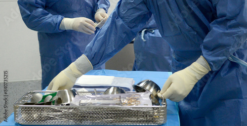 des chirurgiens gantés préparent le matériel nécessaire à une opération chirurgicale